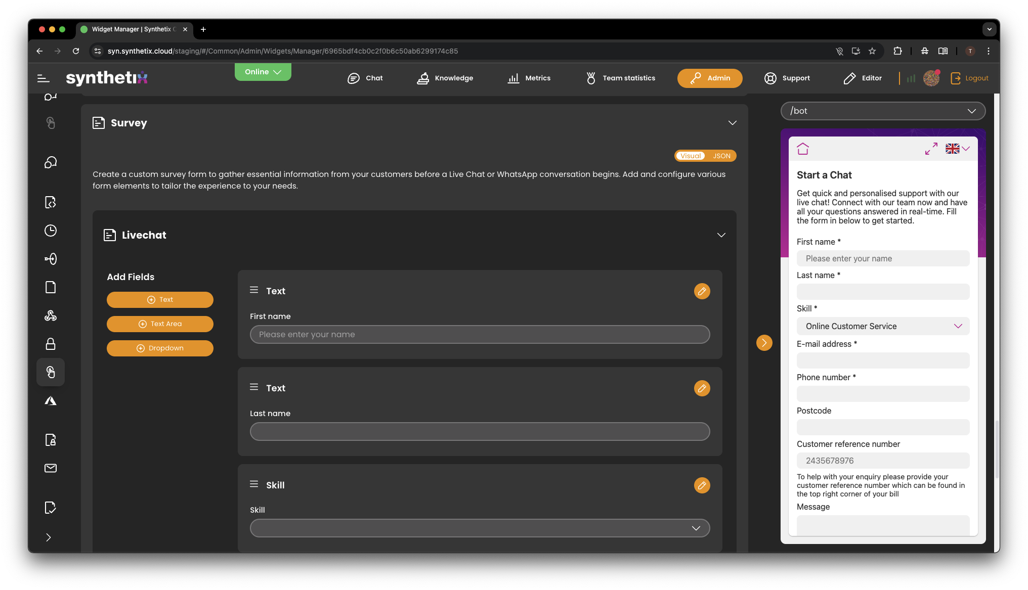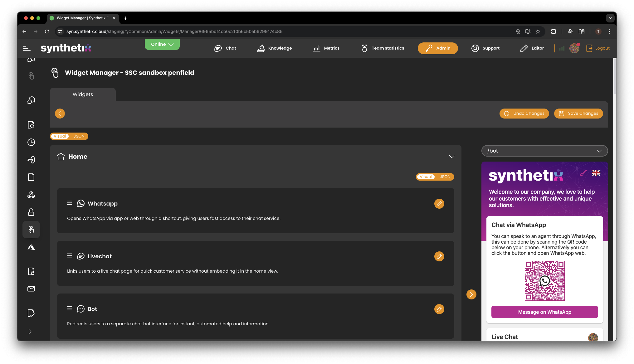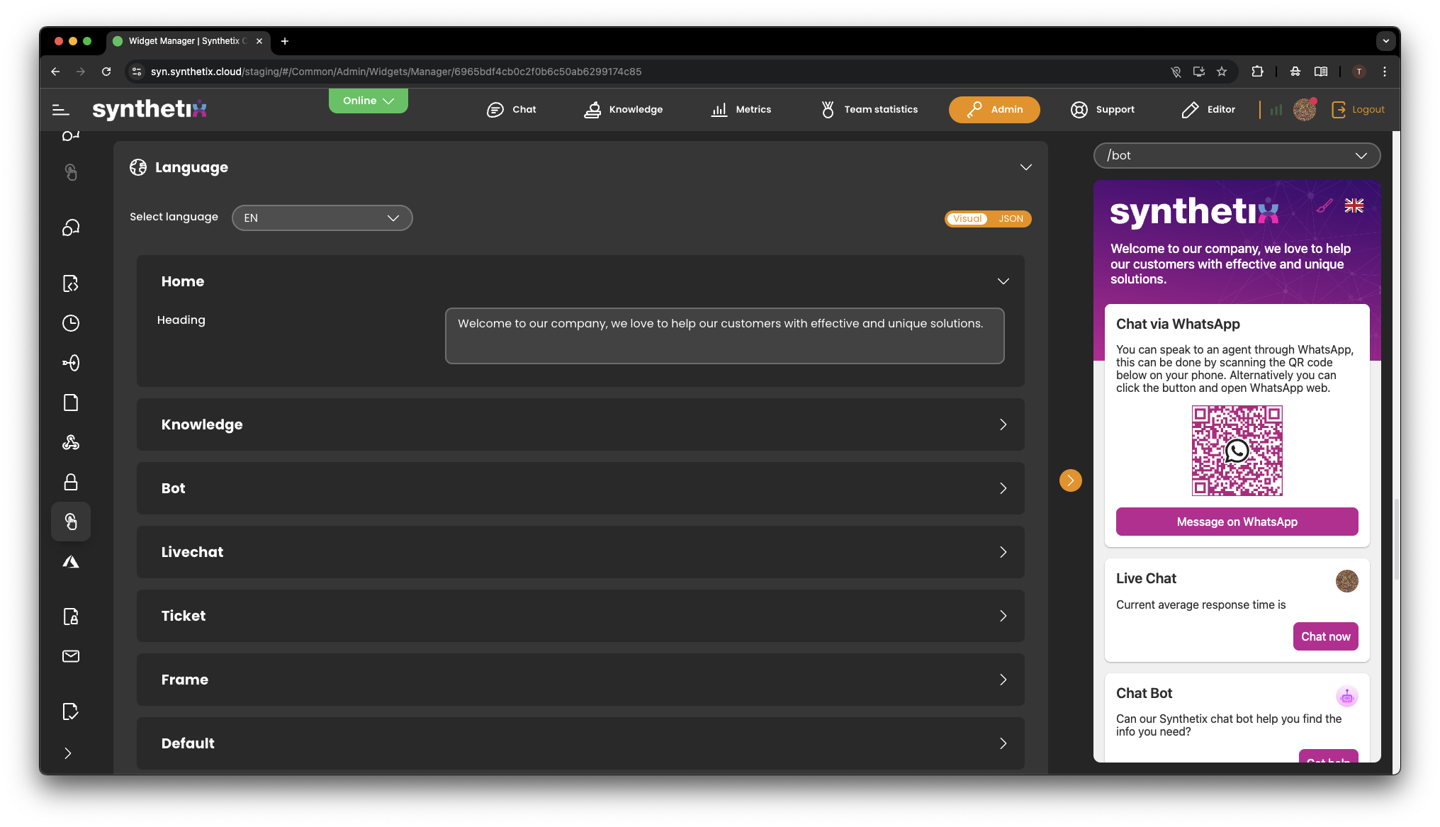 - Re-order options such as Live Chat, WhatsApp and Bot